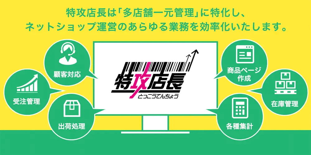 特攻店長は多店舗一元管理に特化し、ネットショップ運営のあらゆる業務を効率化する一元管理システムです。楽天市場、Amazon、Yahoo!ショッピング、自社サイトなど、複数の販売チャネルを一括で管理し、受注・在庫・出荷業務を自動化。煩雑な作業を効率化し、人的ミスを防止するとともに、戦略的な業務へ集中できる環境を提供します。これにより、EC事業者様は業務の効率化とコスト削減を実現しながら、さらなる事業成長を目指すことが可能になります。