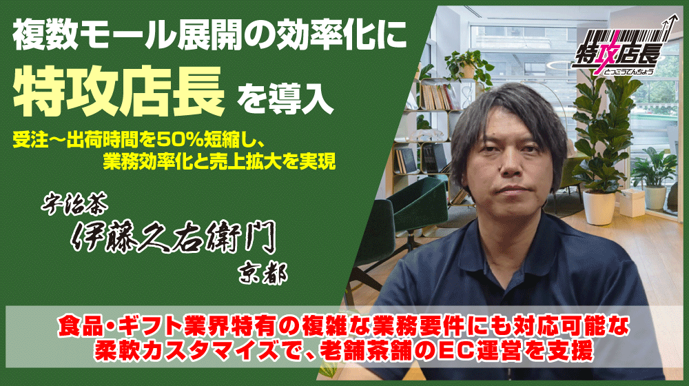 EC業務を効率化する一元管理システム「特攻店長」を提供する株式会社キャプサー(本社:兵庫県神戸市/代表取締役:縄舟 優一)は、京都・宇治の老舗茶舗である株式会社伊藤久右衛門(所在地:京都府宇治市/代表取締役:広瀬穣治)が、EC事業において「特攻店長」を導入したことをお知らせいたします。